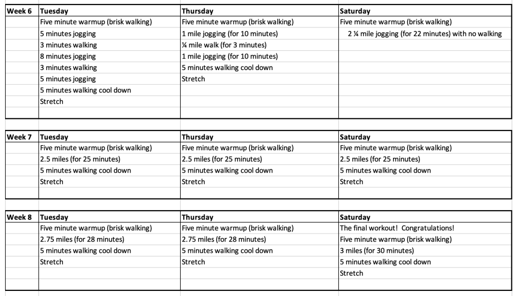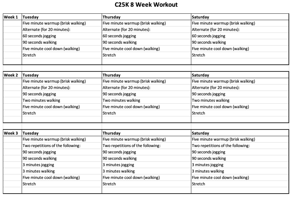 Whether you’re new or experienced to walking or running a road race I suggest you follow a training program. Training programs are designed to help you build from your current physical condition to either complete or compete depending upon your personal goal. There are many training programs available on the “App” Stores for your phone. In the past our training groups have use the C25K or C210K. Most of the apps have a free version with daily training plan for 8 or more weeks (more for the longer distances).