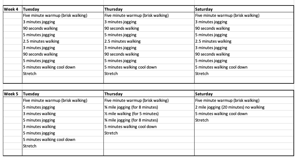 - When training for a race several month away it is easier to have an intermediate targets. Examples: complete training for the week per the training program, train 3 times this week, add some distance or time to a walk or run, etc.